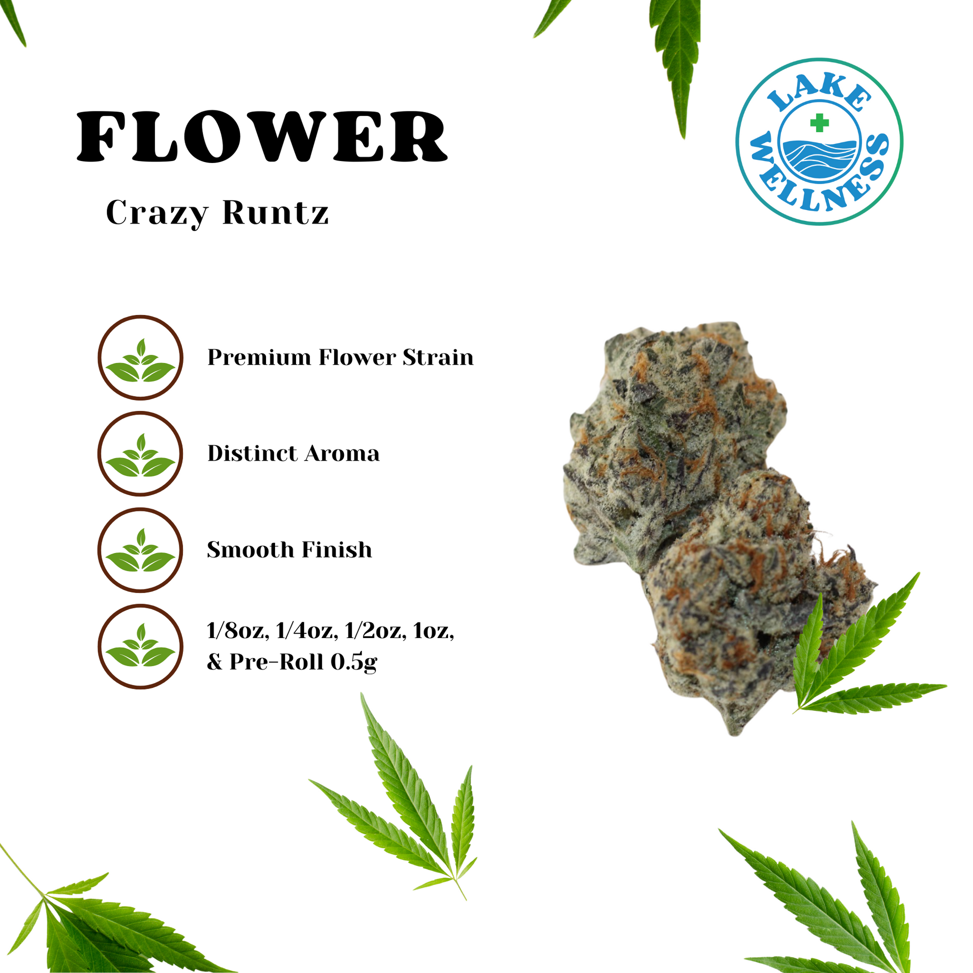 Crazy Runtz is a premium flower strain known for its distinct aroma and smooth finish. Available in both traditional flower and convenient ½ gram prerolls.