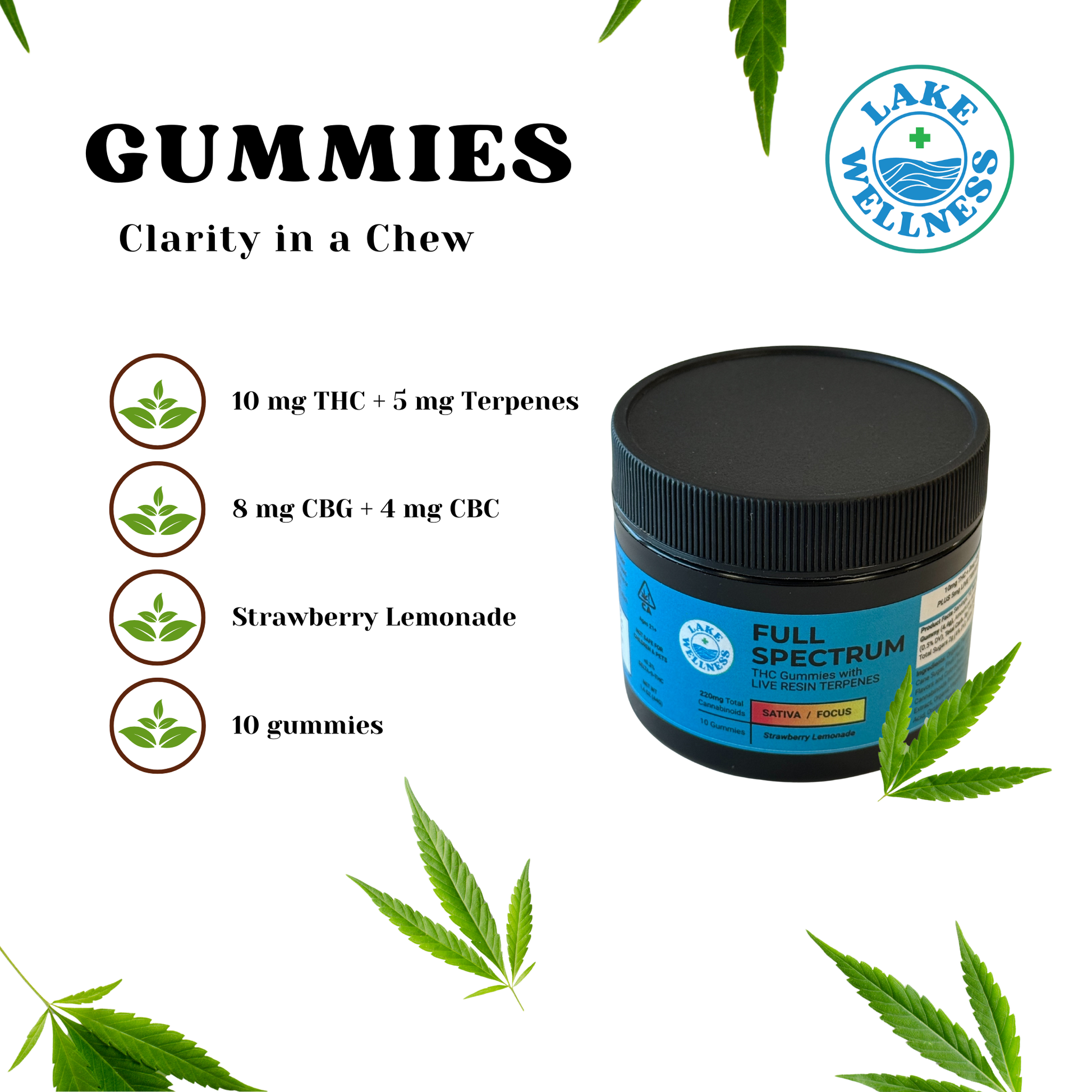 10pk. Enjoy the benefits of cannabinoids in a flavorful gummy format. Focus Sativa - Strawberry Lemonade (10mg THC / 8mg CBG / 4mg CBC / 5mg Terpenes) is designed for targeted support, whether you’re looking to focus, relax, or rest.